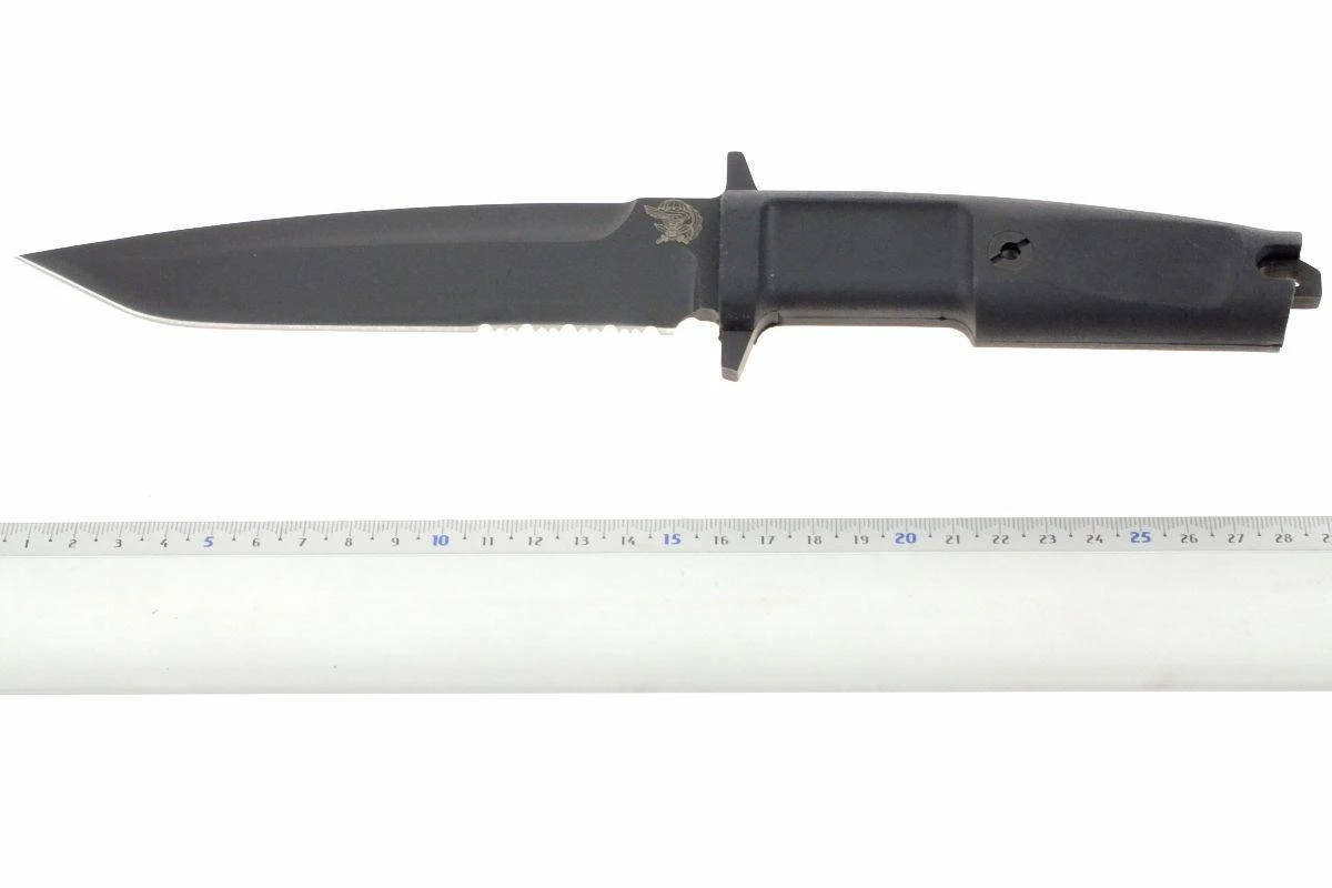 Encargado y adoptado oficialmente en 2002 por el Noveno Rgto. Incursori «Col. Moschin», este modelo es la quintaesencia de un cuchillo de combate puro con una hoja asimétrica. Utilizado por los Arditi, en cuyos pasos sigue el Regimiento Col Moschin, ha sido reelaborado en una forma moderna, dotado de una hoja parcialmente lisa y dentada, guardas integrales y un E.R.M.H. desmontable. Mango en Forprene. La molienda es hueca y afilada. El centro de gravedad está hacia el final del mango, la punta especialmente afilada, es ligera, manejable e intuitiva.