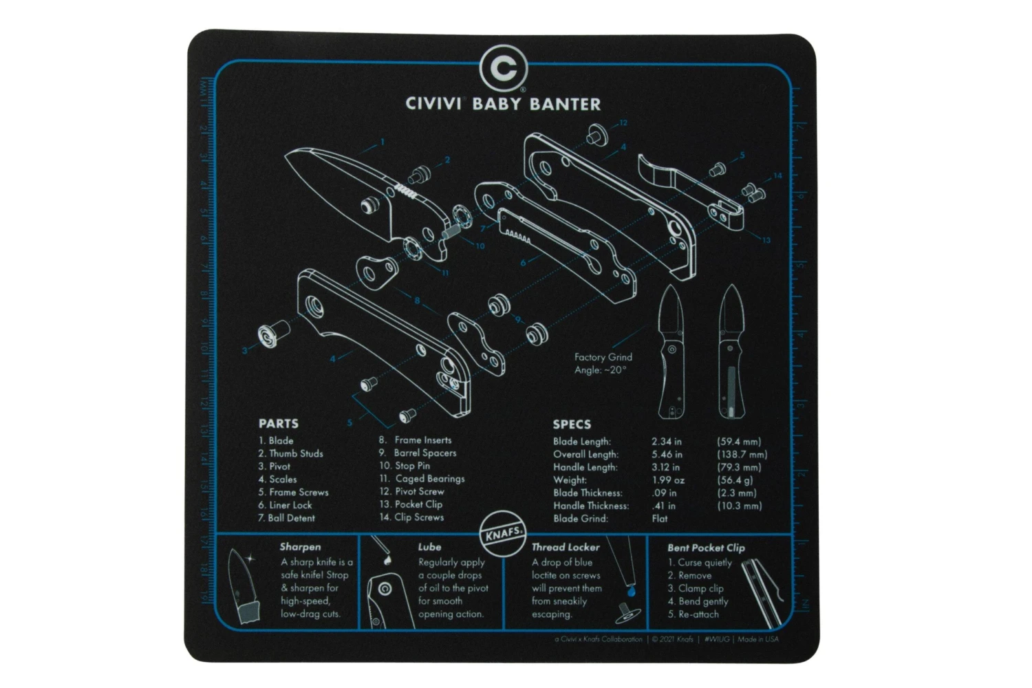 La alfombrilla de exposición Knafs Baby Banter es una bonita alfombrilla de exposición que también funciona como alfombrilla de ratón. La parte trasera tiene una capa de goma antideslizante, para que la alfombrilla permanezca en tu sitio. El diseño fue realizado por el propio Ben Petersen, y muestra todas las piezas y mecanismos de la navaja Civivi Baby Banter.