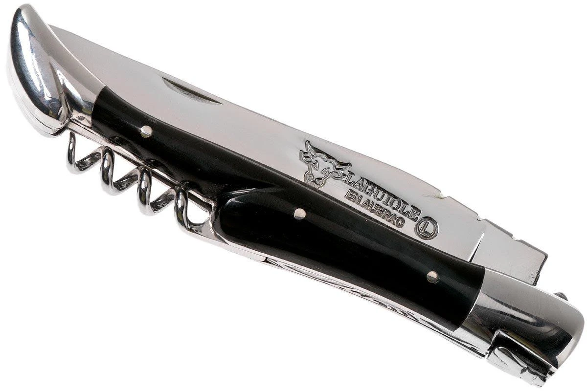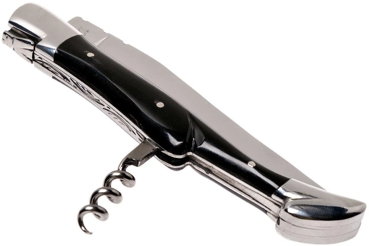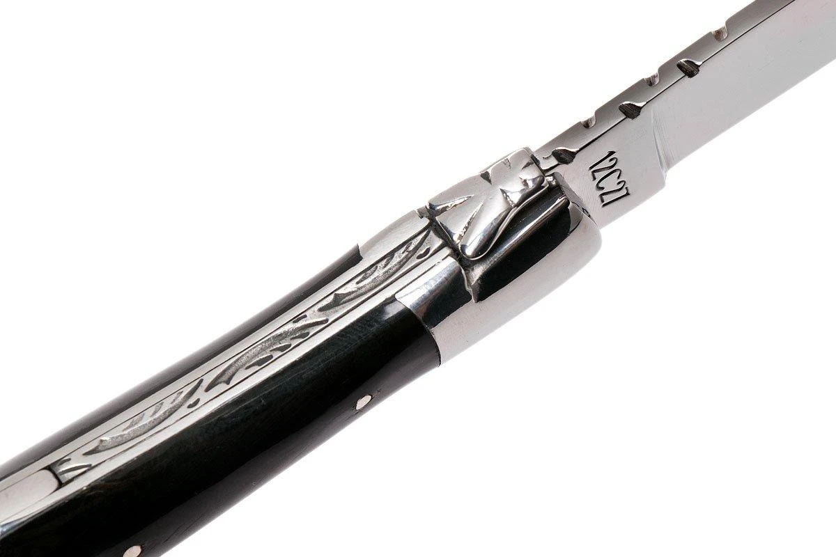 Esta navaja Laguiole en Aubrac de 12 cm tiene un sacacorchos. No sólo se beneficia de las funcionalidades de esta impresionante navaja Laguiole, sino que también es capaz de abrir una botella de vino. El lomo del mango está decorado con un sorprendente trabajo de limado. La hoja está hecha de acero inoxidable Sandvik 12C27. Tanto los cabezales como la hoja están abrillantadas. Esto hace que la navaja tenga un aspecto más elegante.