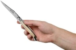 Este cuchillo Laguiole en Aubrac de 12 cm es un verdadero clásico. La parte posterior del mango está ricamente decorada con un delicado trabajo de limado. La hoja está hecha de acero inoxidable Sandvik 12c27. Tanto los cabezales como la hoja están abrillantadas. Esto le da al cuchillo un aspecto muy elegante. Los lados de los mangos tienen la típica cruz de pastor de Laguiole.