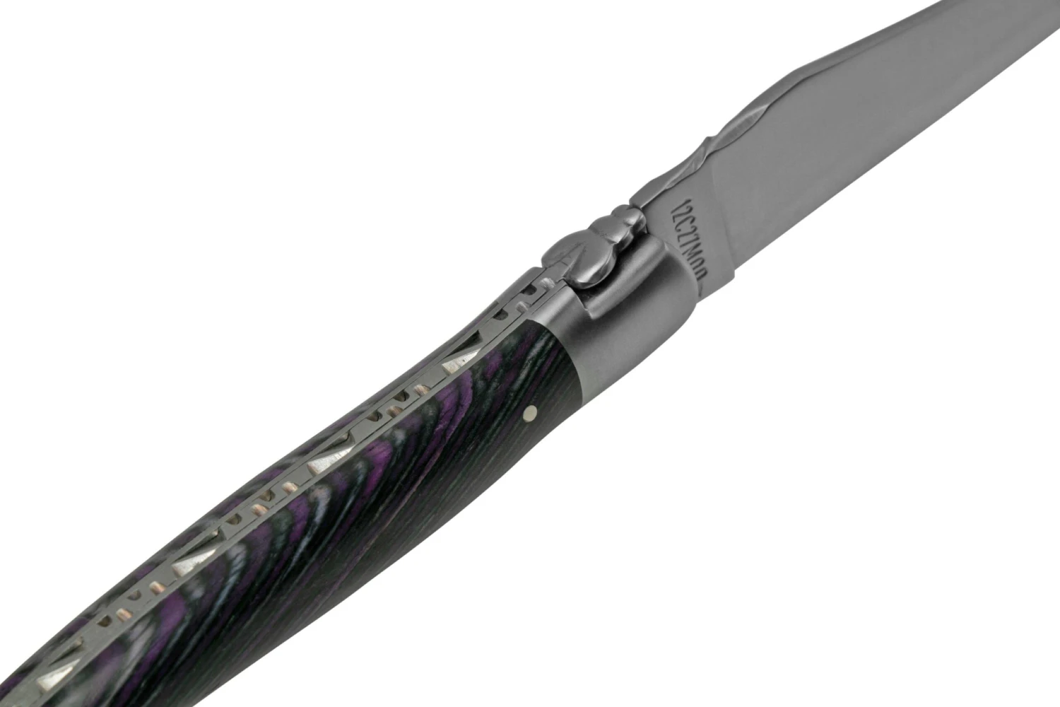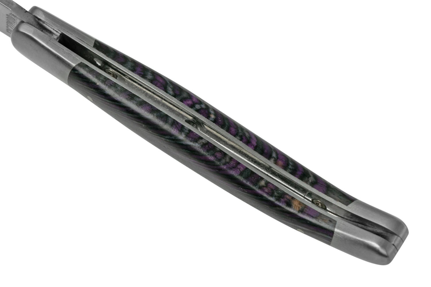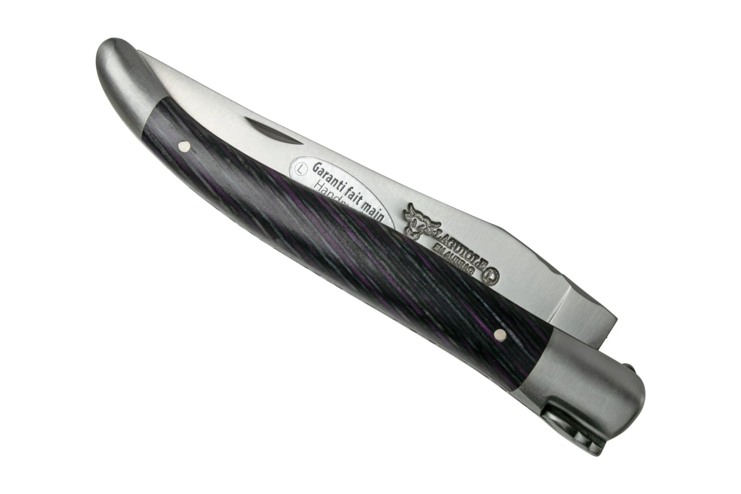 El Laguiole en Aubrac Samba Prune es una versión moderna del clásico cuchillo Laguiole. El cuchillo tiene un mango púrpura y un cabezal y un filo mate. Esta navaja está hecha a mano para garantizar un acabado refinado.