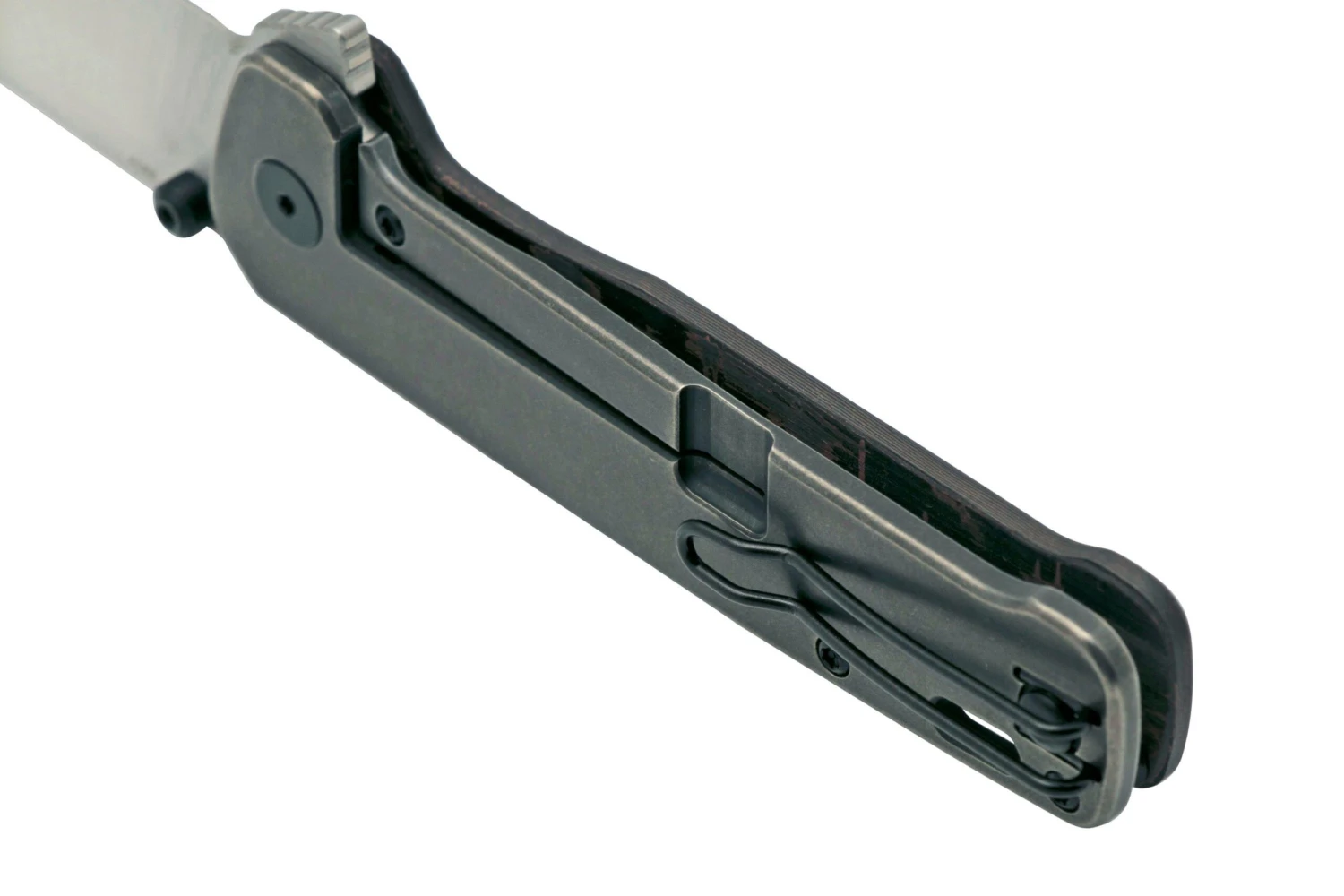 WE Knife Diatomic WE22032-DS1 Gray Bead Blast Titanium, Hakkapella Damasteel Single Edge Navaja